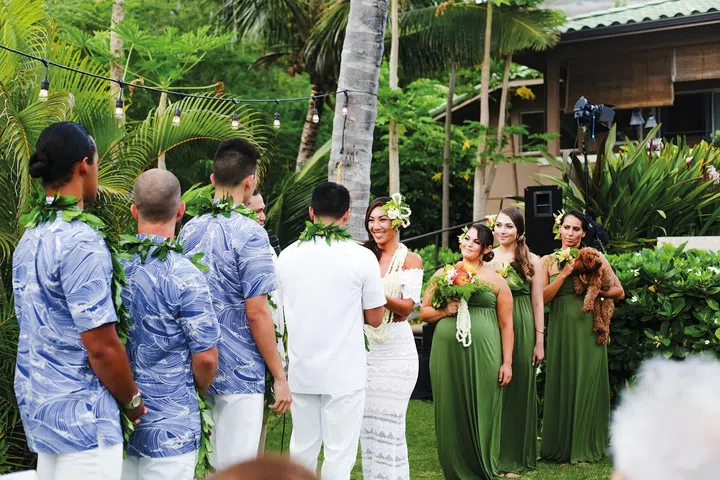 Maikalani and Leiha'aheo'okalehua'omapuana (or Lei for short) first met at Sandy Beach on O'ahu's south shore while diving for shells and drifting trash. "He bumped into me while playing in the waves and offered me a cowry shell he'd found as an apology. Weeks later, a mutual friend introduced us and we hung out in a group doing hikes and dives, and beach days. He asked me out on a date a few months later and the rest is history," says Lei.