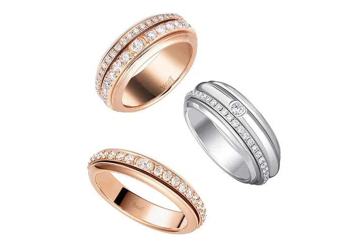Pictured (from top): Possession 18k pink gold ring with 74 brilliant-cut diamonds, 18k white gold ring with 46 brilliant-cut diamonds, and 18k pink gold ring with 36 brilliant-cut diamonds, Piaget