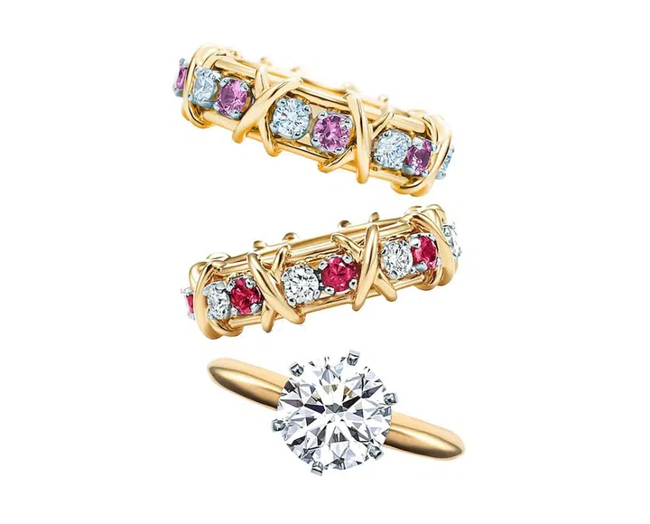 Pictured (from top): Jean Schlumberger rings and Tiffany Setting solitaire gold ring, Tiffany & Co.