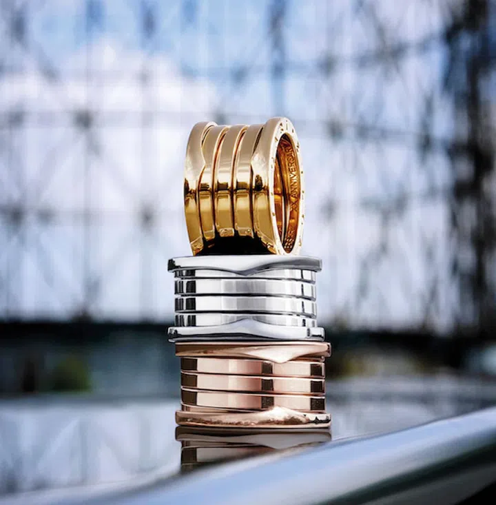 Pictured (from top): B.zero1 rings in yellow, white, and rose gold, Bvlgari
