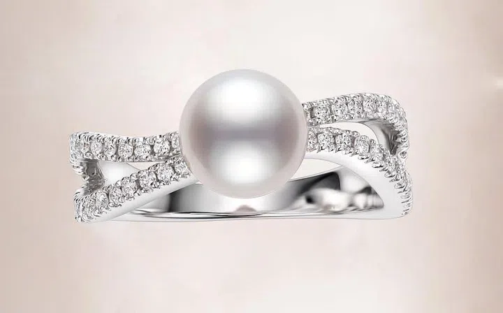 Pictured: 18k white gold ring with Akoya peaerl and diamonds, Mikimoto