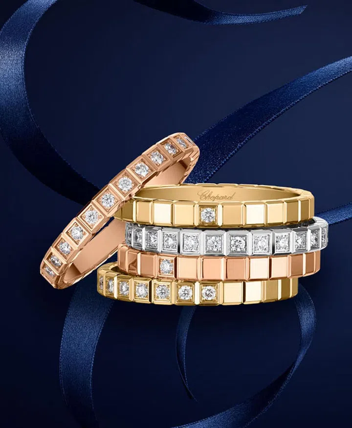 Pictured (from top): Ice Cube rose, yellow, and white gold rings with diamonds, Chopard