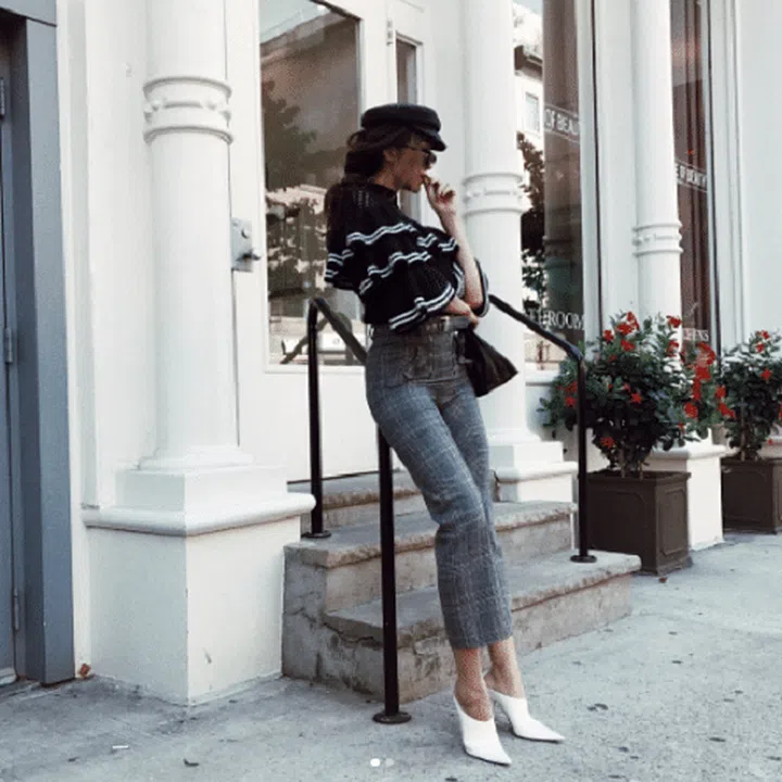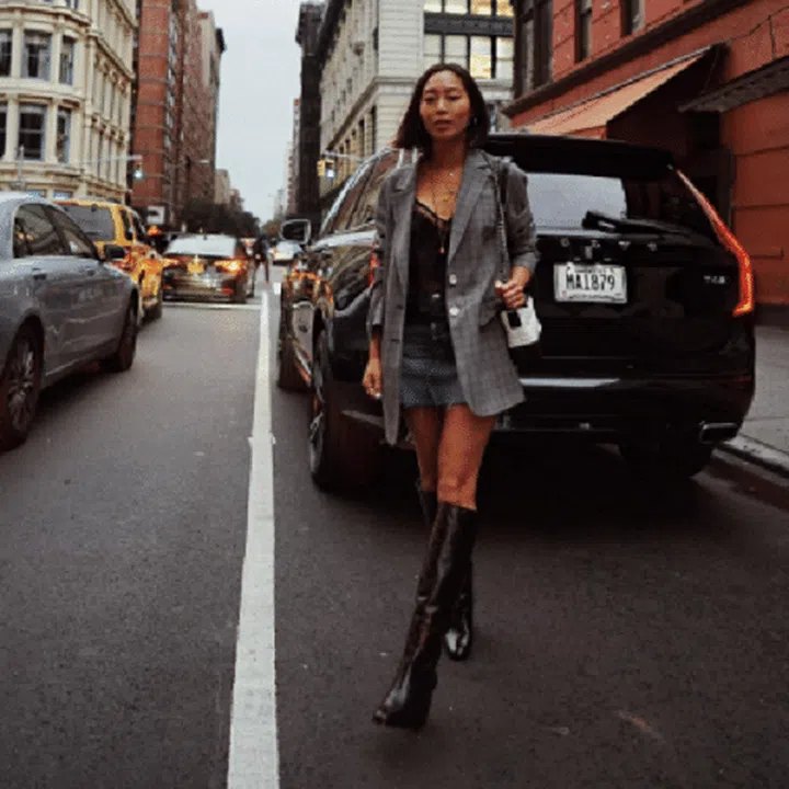 Instagram star, Aimee Song, sported an oversized blazer that was layered over a black tank and denim skirt. To dress up the look, Song opted for some knee high boots from Jimmy Choo.