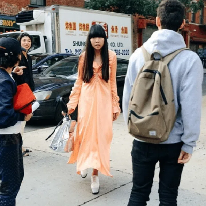 British fashion blogger Susie Lau showcased her flair for fashion and experimentation in a tangerine dress by Sies Marjan. She also showed her whimsical side by pairing her outfit with a silver backpack and white platform shoes.