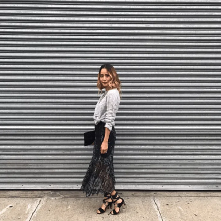 Jamie Chung looked ready for the fall season in her delicate embellished lace skirt from Jonathan Simkhai and knitted grey sweater. Her effortless ensemble was completed with a statement necklace and black clutch.