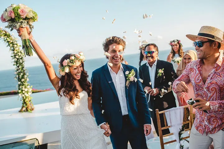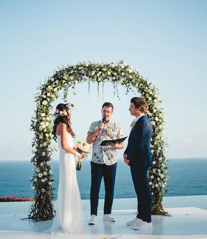 The couple tied the knot with mesmerising cerulean backdrop of the ocean and the sky. All that's really needed was this pretty floral arch to make the solemnisation ceremony unforgettable.
