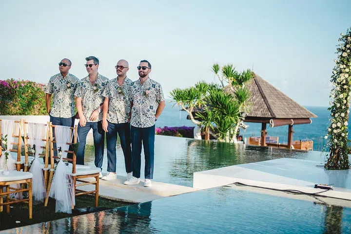 No suits and dress shirts for the groomsmen. Instead, they went for a relaxed ensemble of printed short-sleeved shirts, navy pants, and white sneakers.
