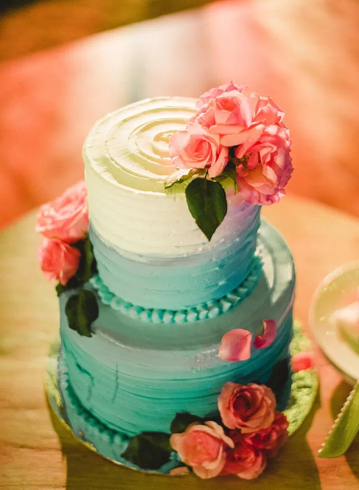 No need for fondant. Buttercream cakes impart a rustic chic charm and this one has the prettiest mint hue, contrasted with pops of coral.