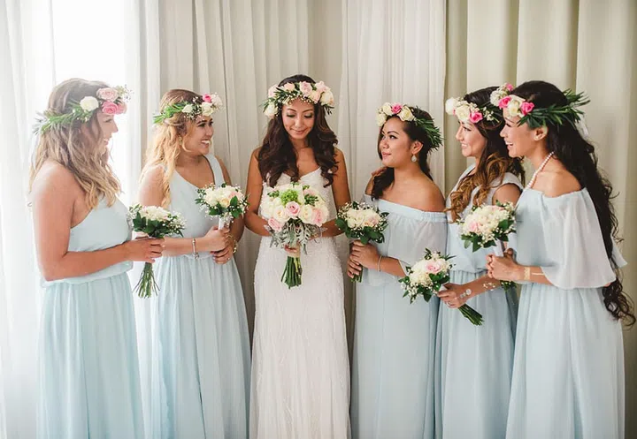 The bridesmaids were charming in matching powder blue frocks and fresh flower crowns. Their posies were smaller replicas of the bride's bouquet.