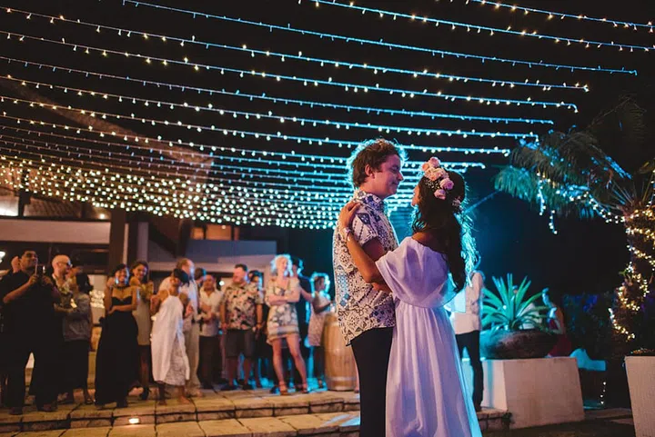 Lights twinkled above as the couple danced, creating a magical and romantic ambience.