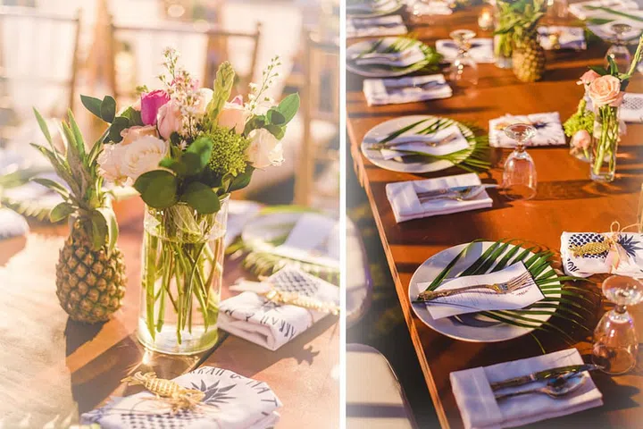Whta's a tropical wedding without pineapples and palm leaves? The creative couple designed most of the details themselves, from the invites to the menus and favours.