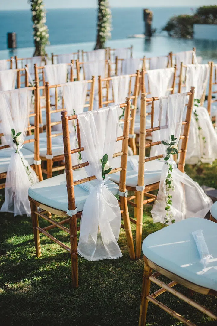 Wooden bamboo chairs lent to the tropical island vibe of the ceremony, prettied up with white drapes and foliage.