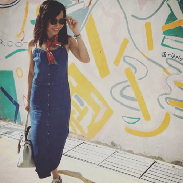 Local media personality Jamie Teo keeps her look simple and comfortable in a denim sleeveless midi from Warehouse, grey sneakers and a white shoulder bag. The trendy fitness enthusiast makes her outfit stand out with a vibrant scarf tied in a knot. This outfit is great for grabbing brunch with the girlies or just running errands.