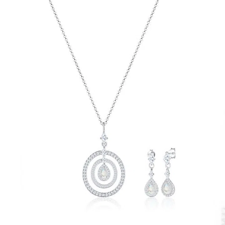 Featuring opalescent Zirconia stones cut to a teardrop shape, this jewellery set features a pair of dangling earrings and a pendant necklace. The necklace comes with a classic O link pendant that exudes timeless elegance, and the sparkling silver earrings lend a dazzling finish.