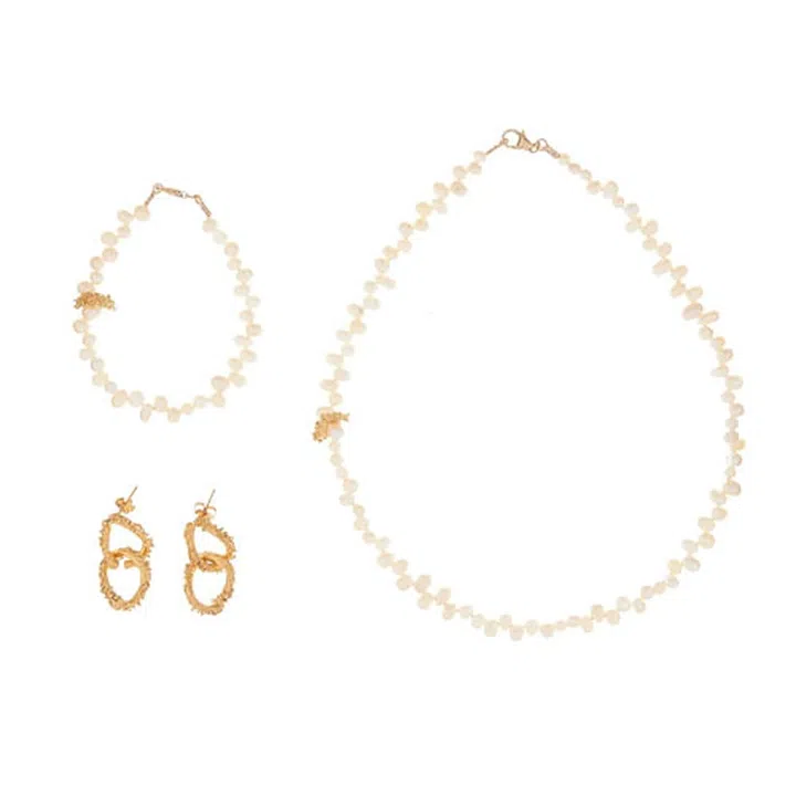 The abstract-shaped earrings and gold-plated charms have a rough coral-like texture, giving the jewellery pieces a modern, artisanal feel the brand is known for.