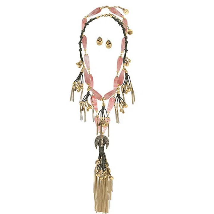 The necklace, perhaps the highlight of the set, is made from rose quartz-toned stones, bronze and gold-tone chain fringing and charms intricately encrusted with sparkling crystals. This number is great for summer vacations or to jazz up a simple dress for a cocktail event.