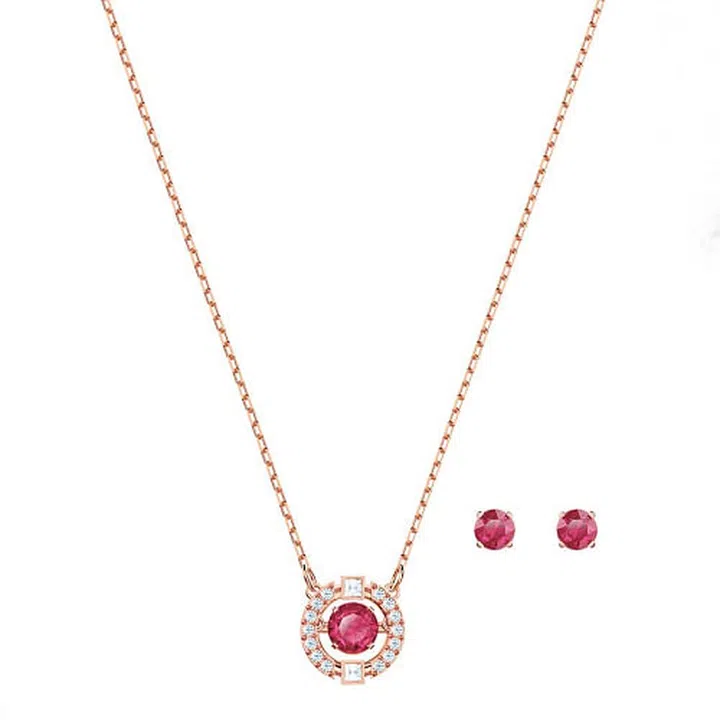 Set with ruby-coloured round diamante stones, this glistening set from Swarovski features a necklace and a pair of studded earrings. Complemented by a rose gold chain, the necklace showcases the dark red diamante by encasing it in a ring embellished by mesmerising crystals.