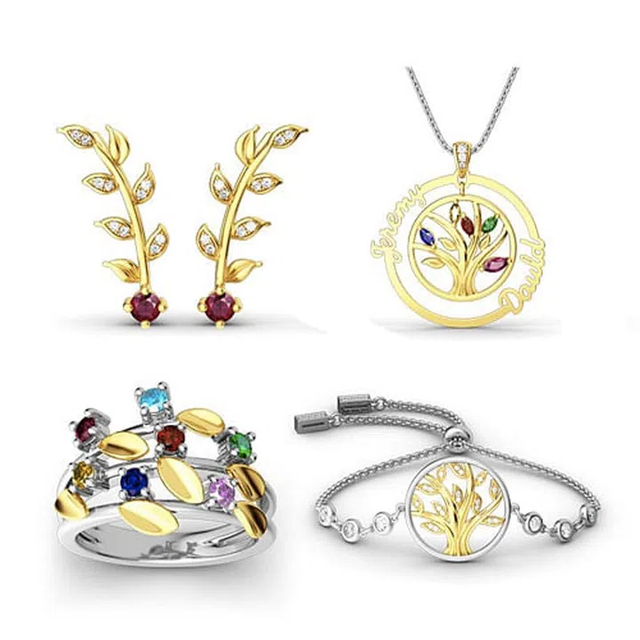 Containing a set of earrings, a pendant necklace, a ring and a bracelet, this thematic jewellery set features motifs of trees and leaves in a sterling silver and gold colour palette. It also has the offer of customisation, allowing you to have the pieces embedded up to five different coloured birthstones with an extra cost.