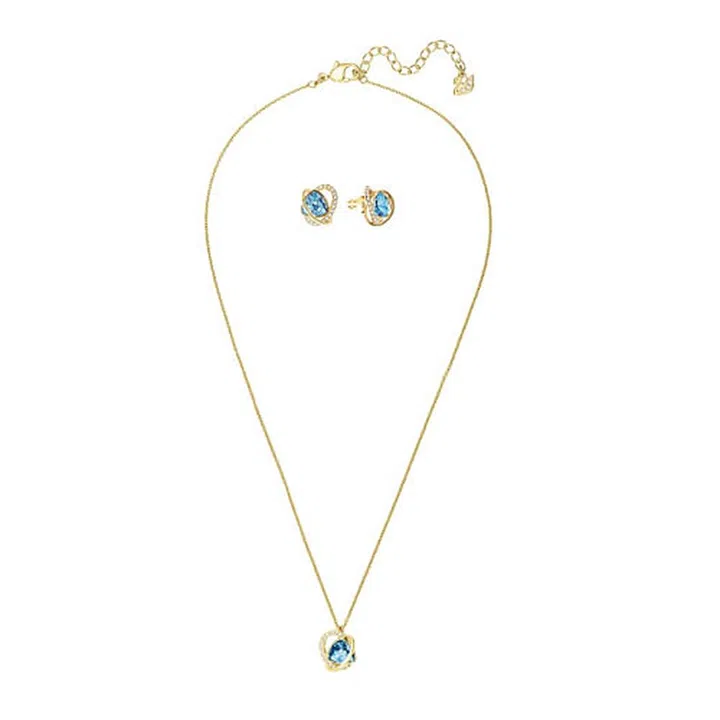The Swarovski Outstanding set features a necklace and a pair of dainty earrings that are set with gorgeous aquamarine-toned gems. Gold-plated rings embellished with pavé orbit around the gems to mimic that of planets in the galaxy.