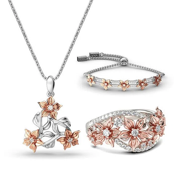 Featuring feminine flowers in a rose gold tone and shimmering round 0.82-karat stones, this set featuring a necklace, a bolo bracelet and a ring band looks especially romantic and divine. Crafted in two-tone sterling silver, this charming collection is a lovely symbol of love and radiant beauty.