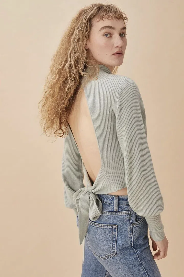 Reformation’s unique sweater appears to call out the name of every experimental dresser out there who appreciates classics with an expected twist. Designed with relaxed blouson sleeves with an extended slim cuff, an open back cutout detailed with a tie, and button knots at the back of the mock neck, this slim-fitted sweater in light green is characterised by its modern and understated appeal.