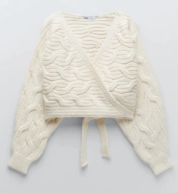 On-trend details, such as a maxi-sized cable-knit pattern, a cropped silhouette and a wrap-style silhouette with tie closures at the hem, come together in this ecru V-neck cardigan. It will look great on its own, styled with a pair of high-waisted mom jeans and your favourite pair of white sneakers. Or, it can also be worn over a sleeveless slip dress – the tie closure allows you to cinch it tighter for a more flattering silhouette so that your overall outfit doesn’t wind up looking too shapeless.
