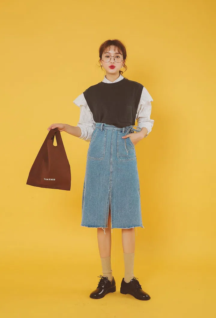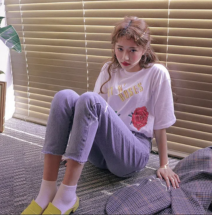 We see vintage band tees all over again, thanks to the resurgence of streetwear and a general sense of nostalgia for the 90s. The Koreans aren’t interested in the grungy look, though; instead, they’ve given the same vintage band tee a most adorable spin. Play around with the outfit by matching it with neutral tones and feminine accessories like frilly socks and slip-in loafers.