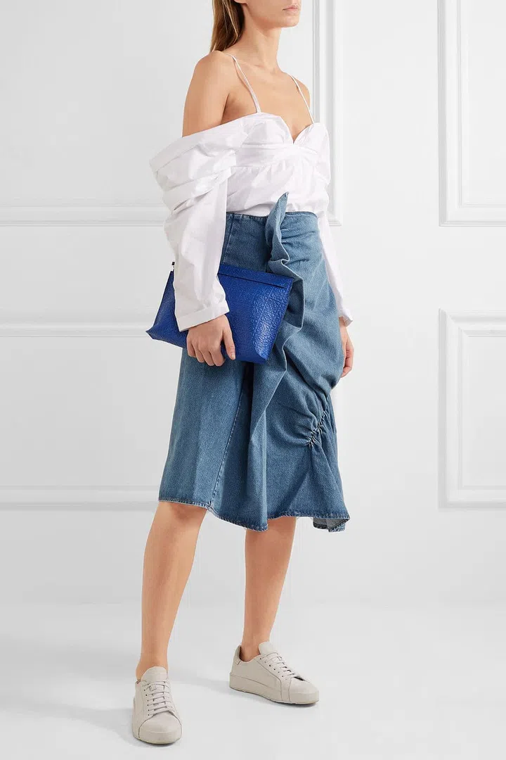 Or go the slightly edgier route with this high-waisted denim skirt from J.W Anderson. Pair it with an oversized white blouse that’s neatly tucked in. Complete the look with a pair of sneakers for a casual chic look. You’ll be luncheon-ready with a colourful clutch for that final touch.