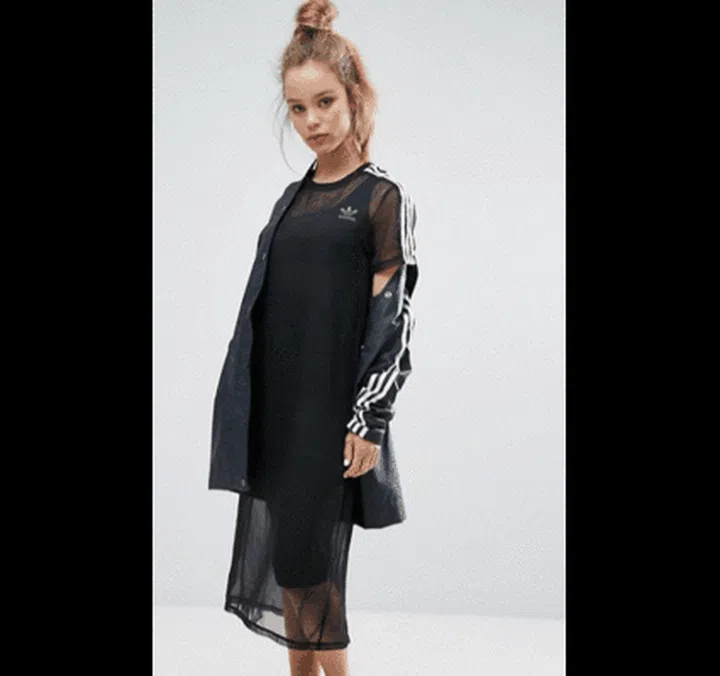 Adidas, Originals black midi dress with sheer mesh overlay, $116.13