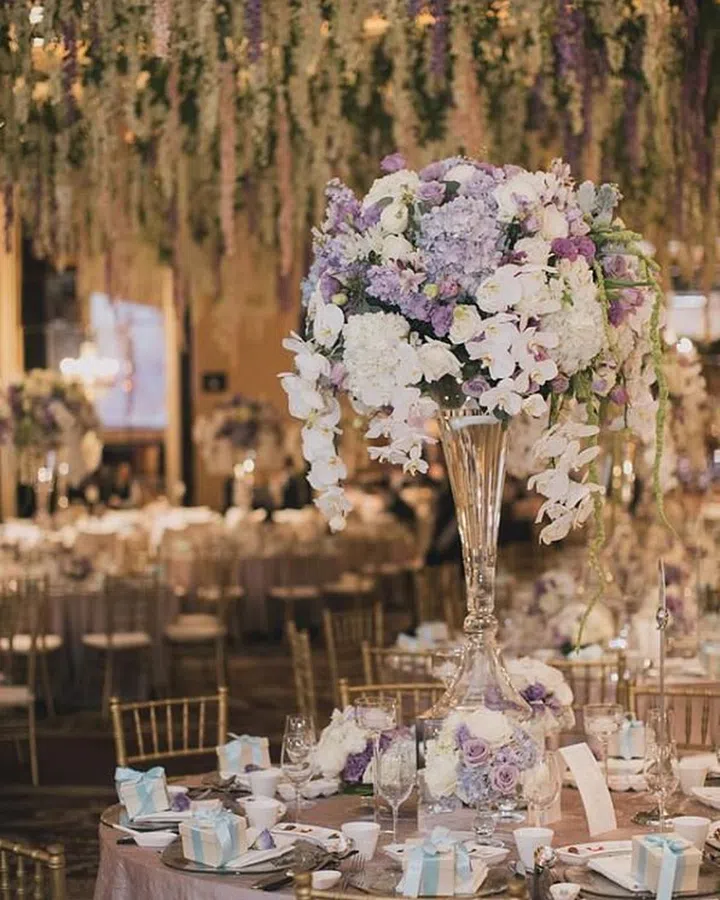 This blooming arrangement of cascading florals in shades of pastel lavender and lilac is refreshingly romantic, and the purple tones pair well with the mustard gold tiffany chairs and foliage accents.