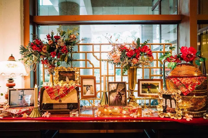 With a luxe gold and red colour palette, this exquisite oriental themed set-up includes plenty of heritage items that oozed vintage charms, and was dressed up with vibrant blooms, warm fairylights and floral fabrics.