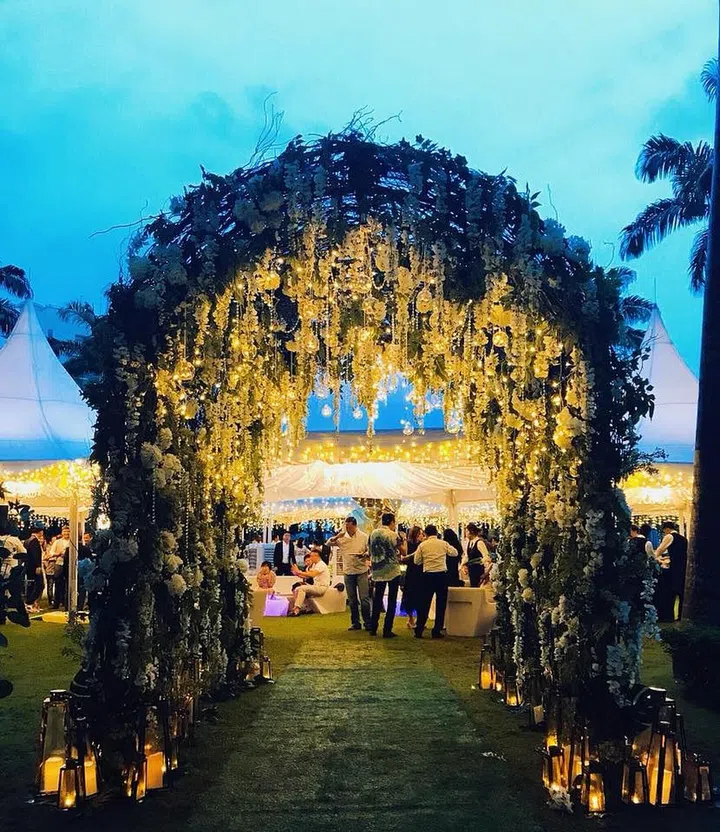 Consider creating a entrance way that's not just a pathway; like this stunning arch with hanging bulbs and flowers which perfectly sets the tone for a glam outdoor wedding affair.