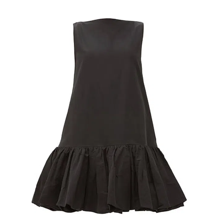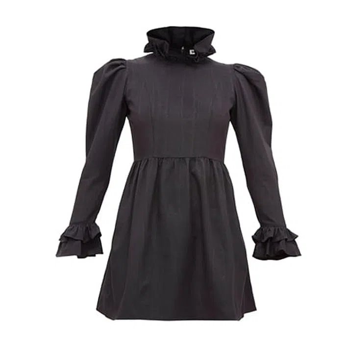 The fashion world’s recent fascination with romantic, Victorian era-esque details basically calls for the addition of this sweet ruffle-neck number. Crafted with the requisite puff-sleeves with ruffled cuffs, a babydoll silhouette and made from lustrous moiré, Batsheva’s LBD looks incredibly feminine and on-trend. Add an edgy twist to your look by pairing it with a pair of combat boots and regal jewel-toned accessories.
