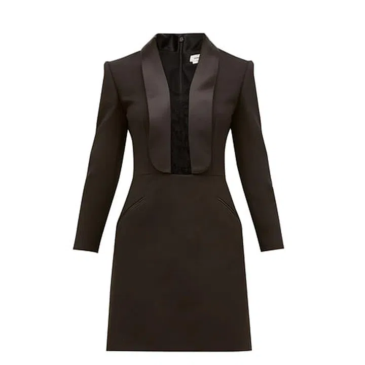 Giving the classic tuxedo dress a sexy spin, this tailored mini dress from Alexander McQueen showcases a lace insert peeking out between lush satin lapels designed to mimic shawls, and clean, flattering lines. Perfect for professional galas where you’d want to look immaculate, this number will look great next to a statement bright coloured minaudiere and a pair of crystal-embellished high heels.