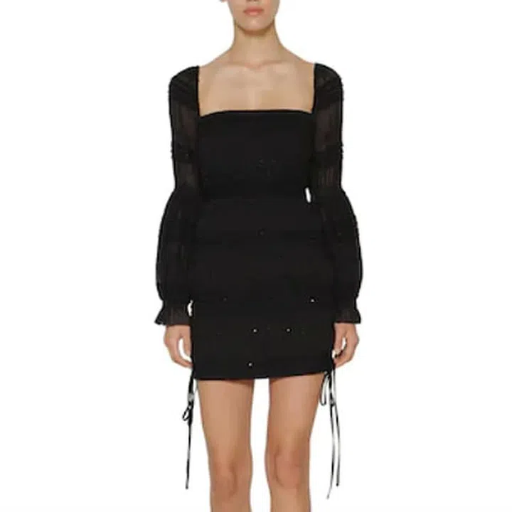 Featuring a square neckline and long sheer sleeves fitted with elastics for a romantic “puffed-up” effect, this mini dress comes embellished all-over with beads and sequins. It also has a slight ruching effect along the sides of the skirt, with the ribbons dangling as an added detail. We’ll be pairing this with a sparkling top-handle tote bag, a dainty chain necklace and a pair of mid-calf boots with sky-high stilettos.