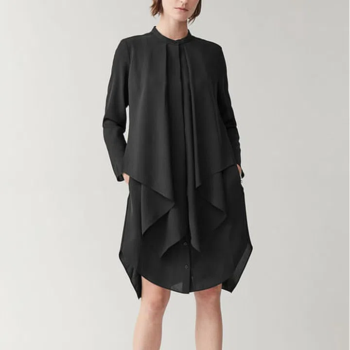 Who says an LBD has to be uncomfortable? This flowy dress from COS clearly begs to differ. Offering a more contemporary feel, this lightweight dress comes with a draped front layer that cascades softly into ruffles. Team yours with a pair of sensible loafers and keep it minimal with the accessorizing.