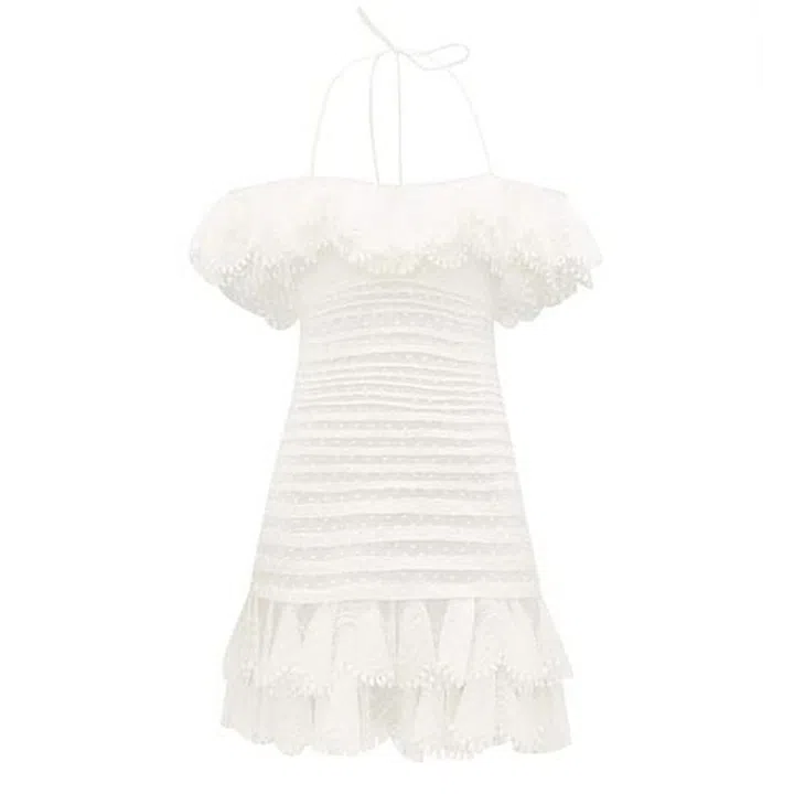 Zimmermann’s romantic and feminine aesthetic shines through with this pretty off-the-shoulder number that’s finished with scalloped-hem frilly ruffles decorated with mini pompoms.