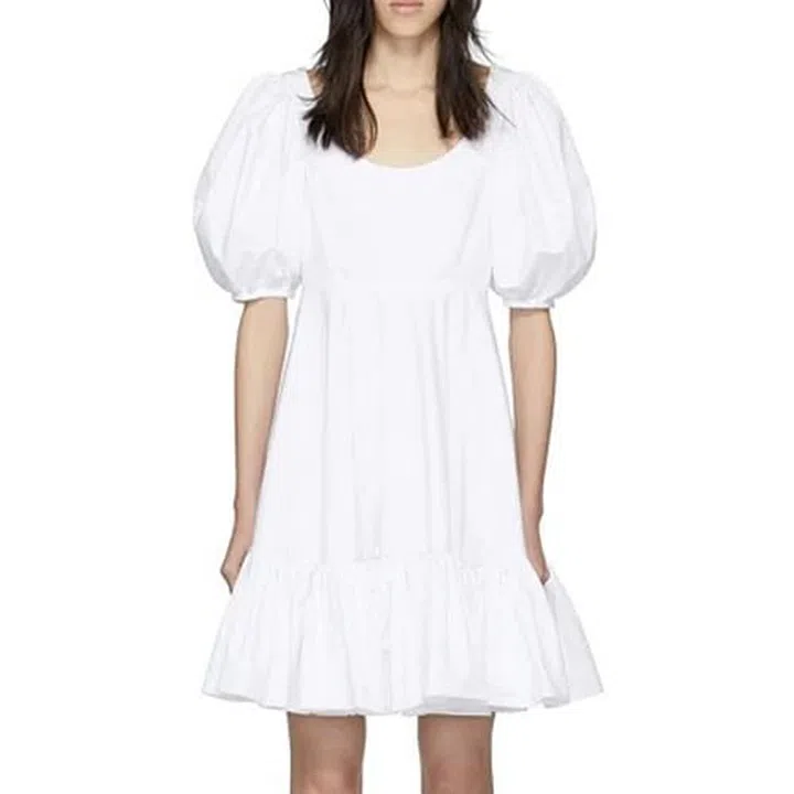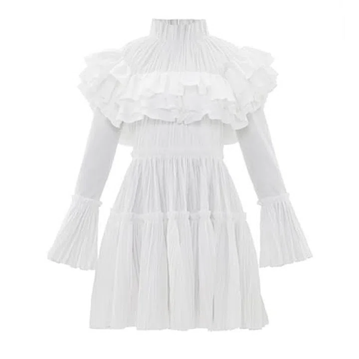 A stunning white cotton dress that draws on Victorian influences from the high pie crust collar, to the multi-layered ruffles that accent the shoulders and torso. Crafted from crisp cotton finished with delicately plissé pleats, this dress also has long fluted cuff sleeves and a tiered skirt as added details. Style this with gold hoop earrings, a high messy bun like how Crash Landing on Your star Son Ye-jin does it and a pair of espadrilles.