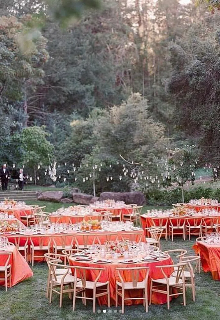 For those that want to use the shade on a greater scale-- bright coral tablecloths with matching floral centrepieces will make for a fun yet romantic setting, especially for evening receptions or outdoor wedding dinners.
