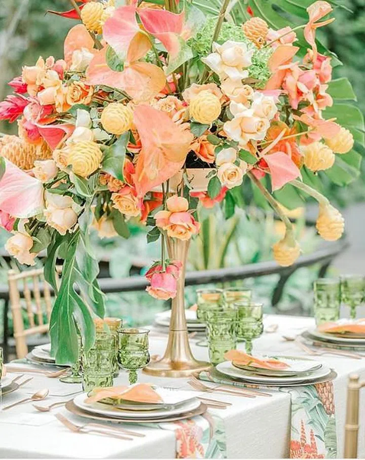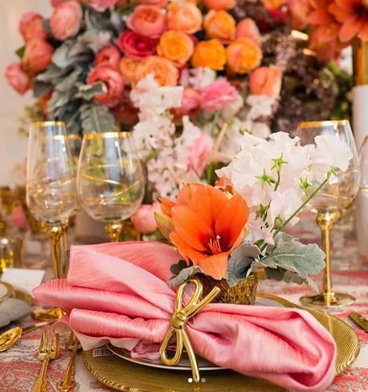 A luxurious arrangement of oranges and warm pinks, complete with gold accents and tableware fit for a royal wedding.