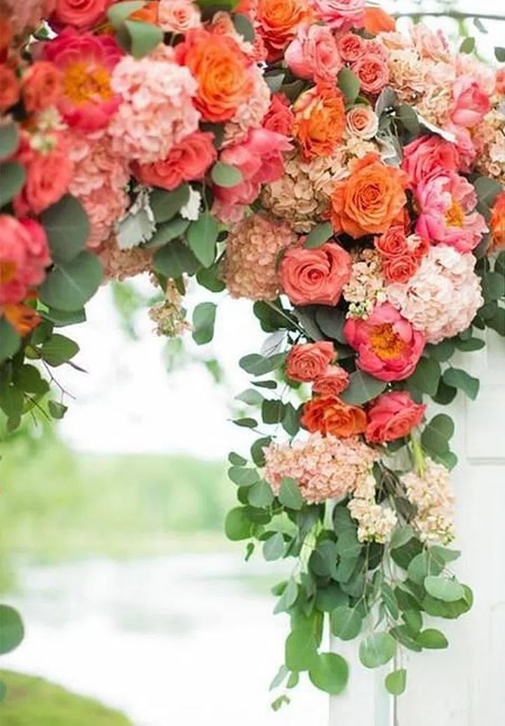 This wedding arch of vibrant corals and sweet pinks is a great accent for a classy outdoor wedding located amidst lush greenery- the garden roses, peonies and hydrangeas will provide a romantic and enchanting backdrop while you exchange your vows.