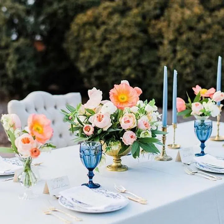 Instead of having coral as the main theme for your wedding, you may also opt for a complimentary colour palette-- in this case, blue and gold, with a few coral accents.
