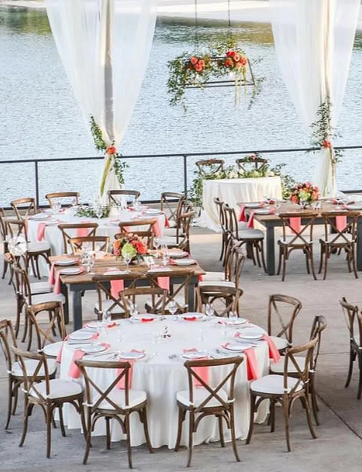 An abundance of greenery and bright coral napkins and curtain ties add a vibrant pop of colour to the outdoor wedding decor, while matching the modern floral centrepieces on every table.