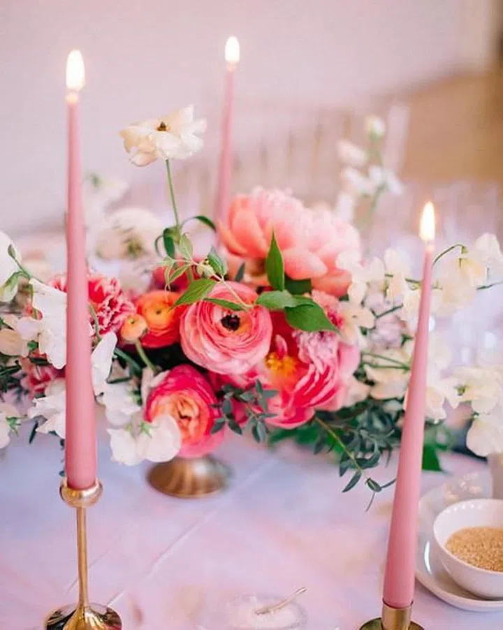 Pink peonies, carnations, and ranunculus blooms are complemented by creamy white lilies of the valley and sweet pea flowers, matching the pink candles and white tablecloth.