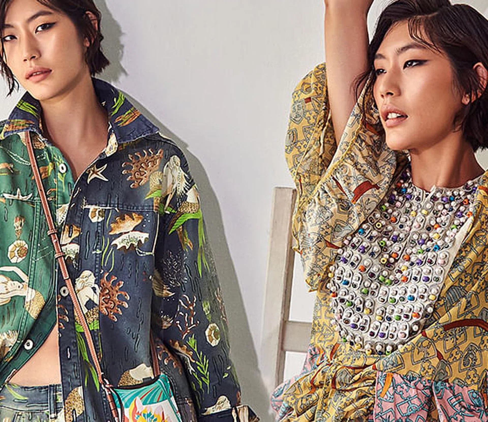 New prints include the crests on playful tiered dresses and robes, some decorated with novel beaded bibs. The new prints also appear on patches on denim jackets and shirts. Another interesting addition is the introduction of tie-dye, seen on many of the T-shirts, jeans, as well as hoodies.