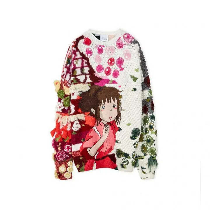 In this line, some of the most iconic moments from anime auteur Hayao Miyazaki’s work turn up on a host of ready-to-wear and leather goods. These range from printed wardrobe staples and SLGs to splendidly complex knits with appliques of the movie’s characters.