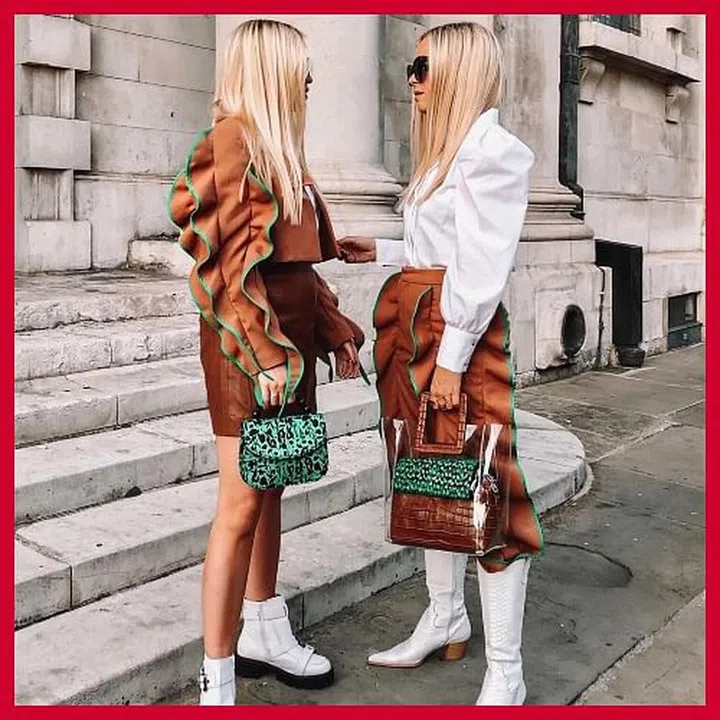Here’s a less tacky way to do matchy-matchy with your girlfriend: Colour coordinate your outfits. Olivia and Alice (founders of fashion label Amelia Jane London) went with a palette of brown and white with splashes of green.