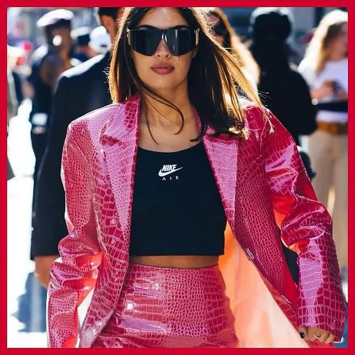 We love pink, and we also adore snakeskin – but we never realised how good the two looked together until fashion influencer Patricia Manfield wore this pink python embossed faux leather skirt suit at LFW this year.