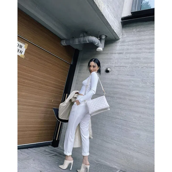 If you love white purses, challenge yourself to recreate Hwasa's stunning all-white look. Definitely an eye-catcher.