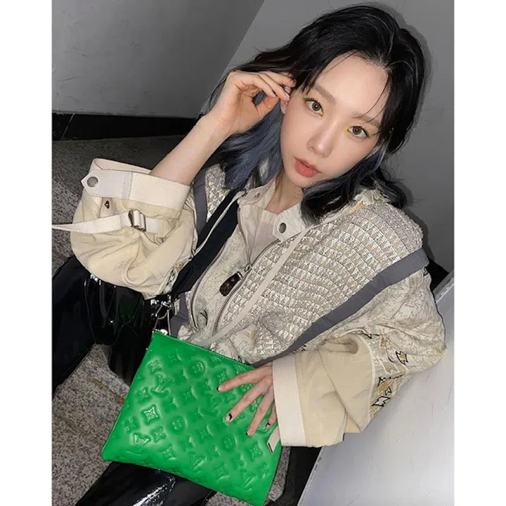Taeyeon opted for a bright green Louis Vuitton Coussin PM handbag to accent her neutral-toned outfit. Wearing the bag as a crossbody lends casual everyday ease.